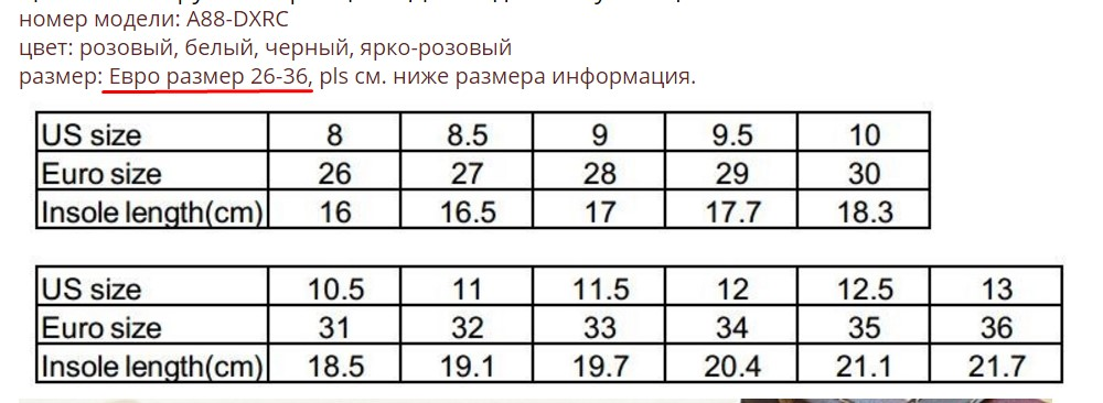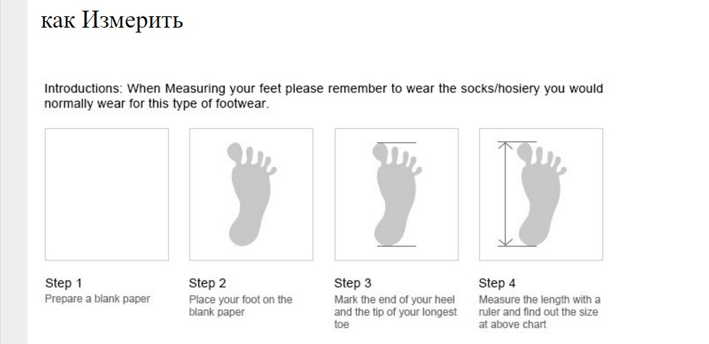Как и с одеждой, русские или европейские обозначения обуви здесь могут не совпадать с фактическими. Поэтому лучший способ — измерить длину стопы.